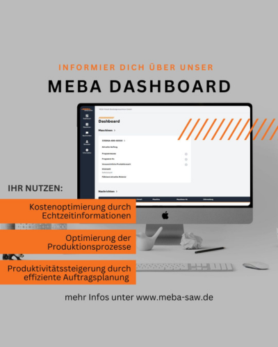 MEBA Metall-Bandsägen können ab sofort mit dem MEBA Dashboard ausgestattet werden. Es gibt eine klare Übersicht über Produktionsprozess, Auftragsübersicht, Maschinenzustände, Maschinenstatus, Leistungsdaten, anstehende Wartungsbedürfnisse oder auch Störungsmeldungen. Alle notwendigen Informationen sind damit schnell verfügbar. Handlungen können zentral eingeleitet und Störfällen kann frühzeitig entgegengewirkt werden.